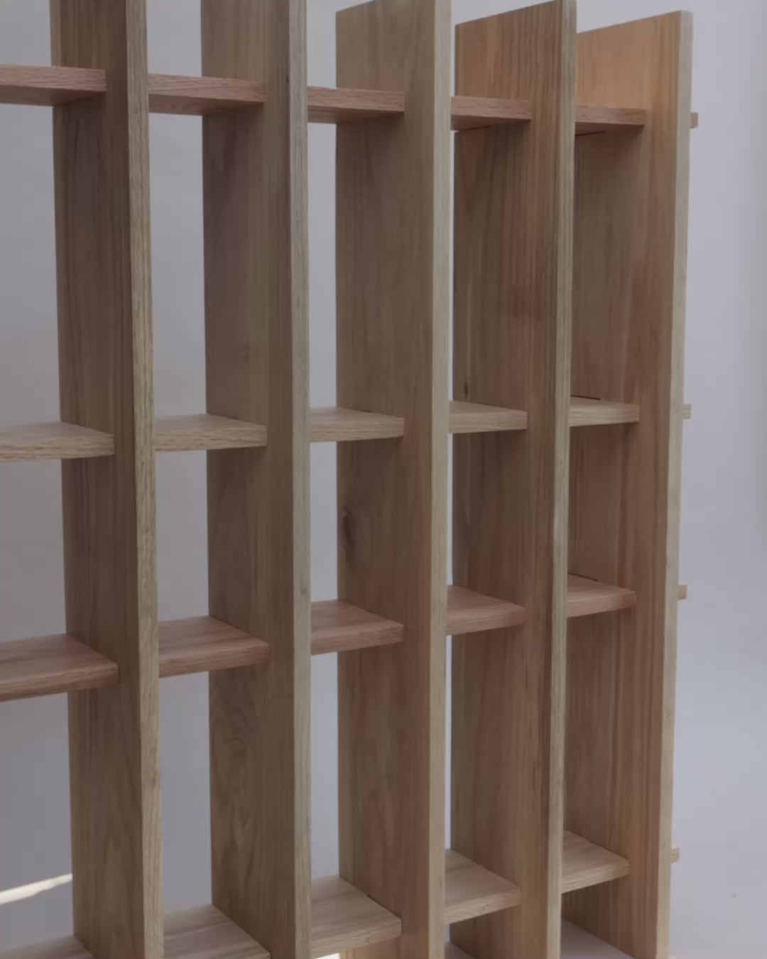 Material: estructura de Encino sólida Acabado: Laca super mate Color: claro cálido Dimensiones: Al 110 / An 95. Dimensión módulo 1: Al 32 / An 15. Dimensión módulo 2: Al 21 / An 15.